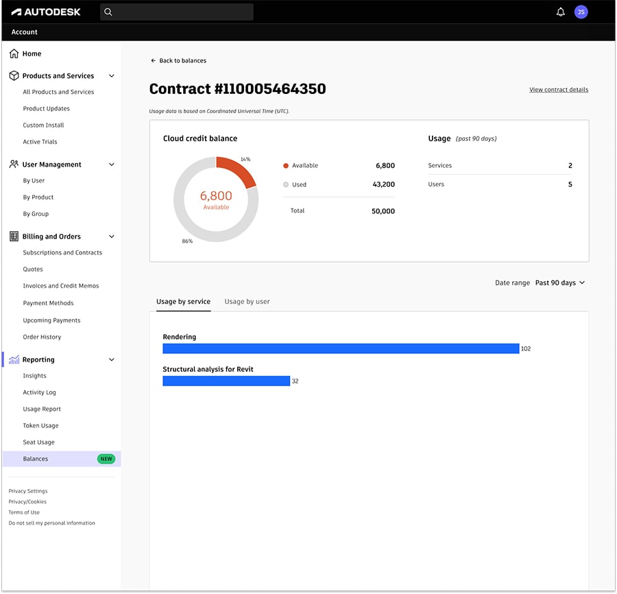 Autodesk 帐户中的“余额”页面显示 Flex 代币和共享远程服务积分的实时余额和使用情况数据。