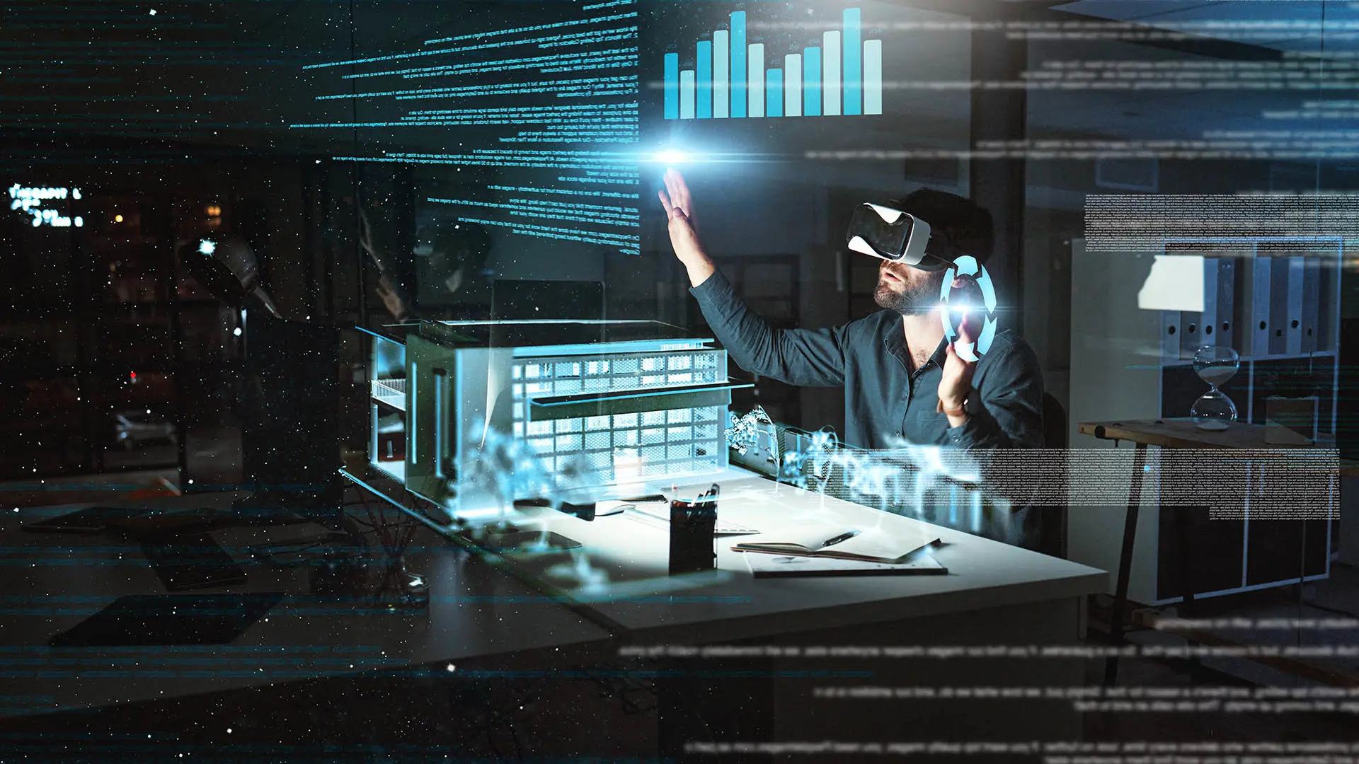 A man wearing VR glasses is sitting at a desk with a building model projected on it.
