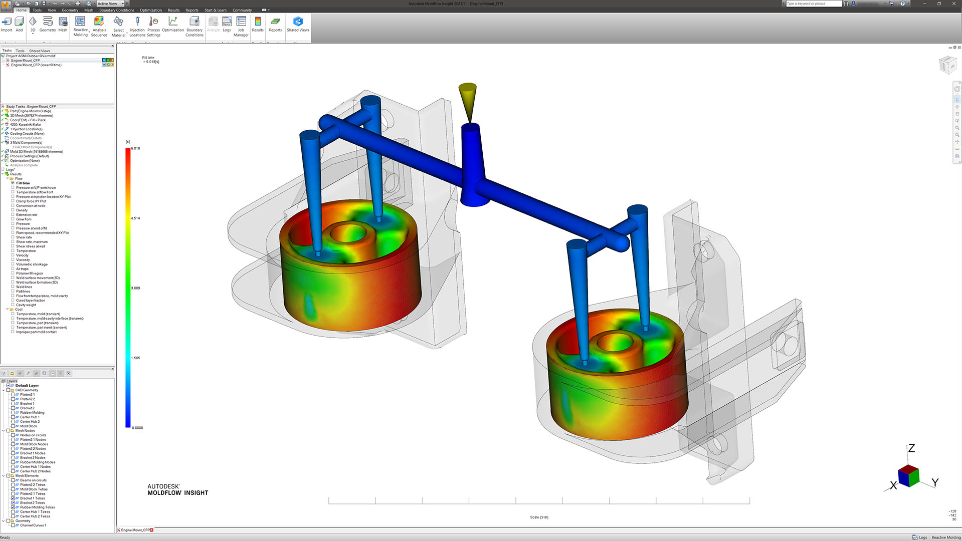在仿真中包含受控阀浇口和顺序阀浇口,以及热流道布局。