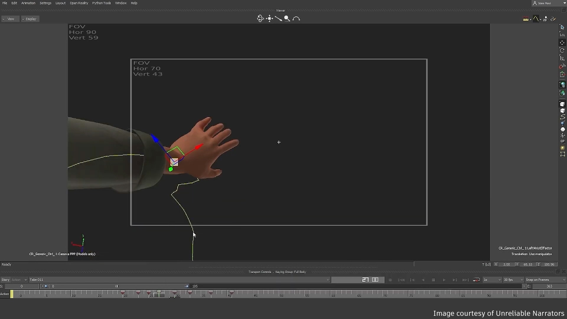 MotionBuilder 中的运动捕捉动画工作。 图片来源:Unreliable Narrators。