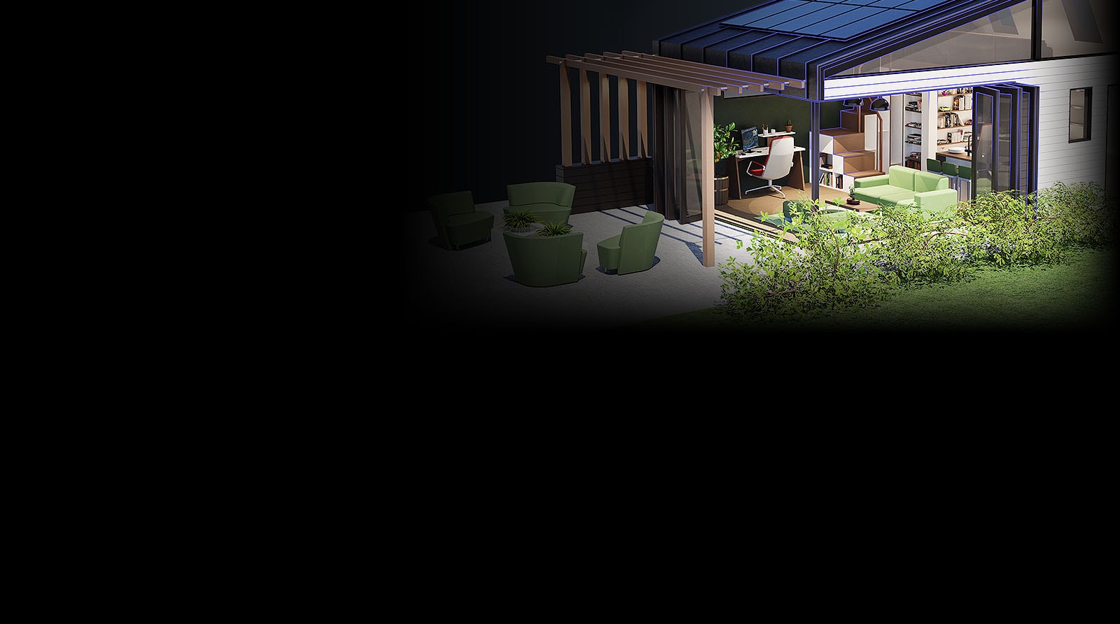 A rendering created in Autodesk AutoCAD shows the inside and outside of tiny home with chairs and green space near the patio.